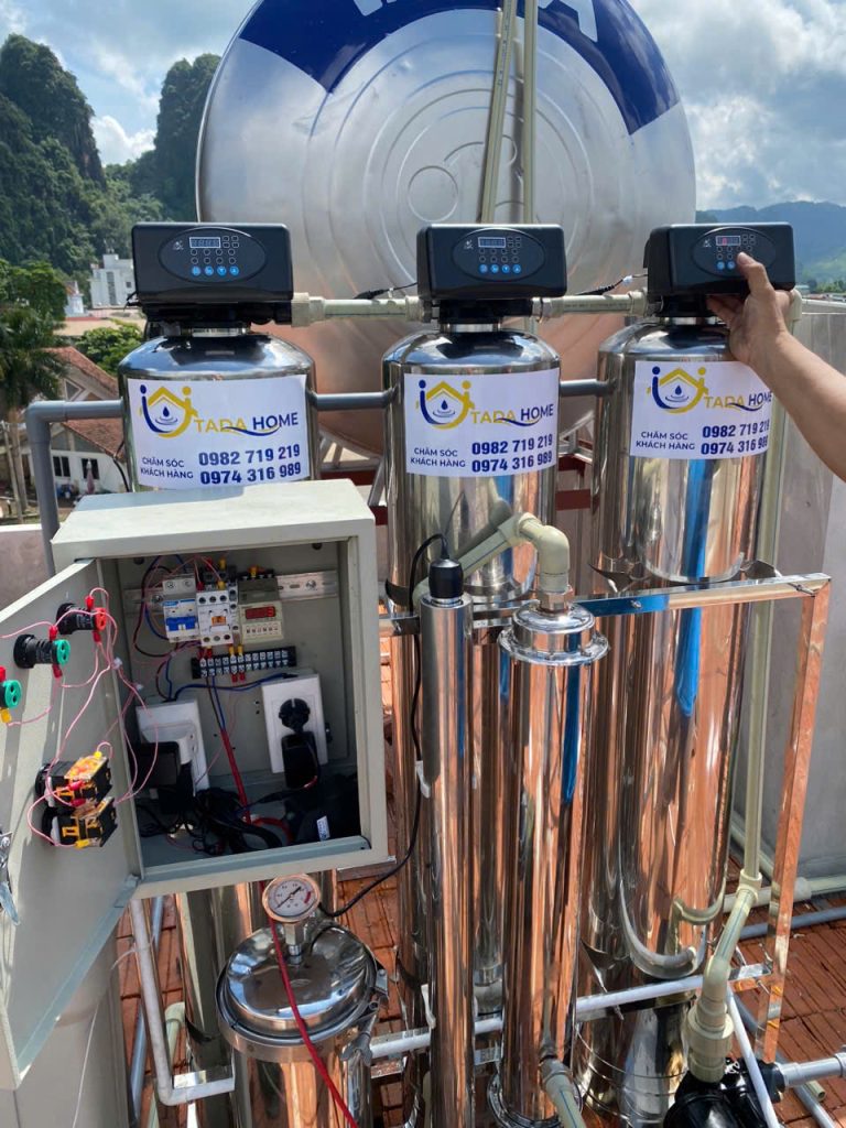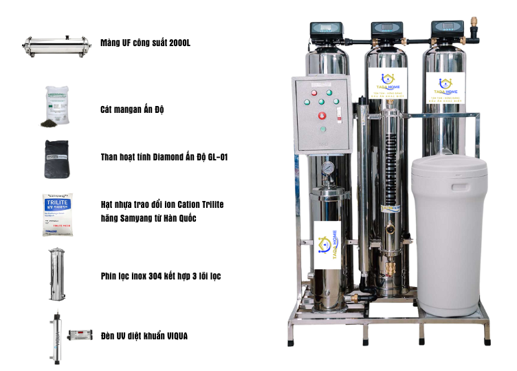 Cấp lọc số 6: Công nghệ màng siêu lọc UF công suất 2000L: Công nghệ màng siêu lọc UF sử dụng sợi hydrophilic PVC để loại bỏ chất keo, chất rắn hòa tan, vi khuẩn và vi rút có kích thước nhỏ.